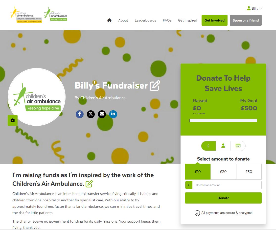 Make sure you share your page far and wide on your socials and tell everyone why you're fundraising for Children's Air Ambulance. You can do this va your online fundraising page.